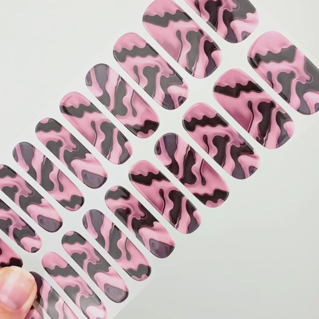 „Silk Drip“ ist Bestandteil der UV Gel Kollektion. Dieses wunderschöne Design zeigt eine abstrakte Komposition aus schwarzen und pinken verlaufenden Farben. Diese atemberaubende Kreation sieht auf jedem Hautton wunderschön aus und passt zu nahezu jedem Anlass.